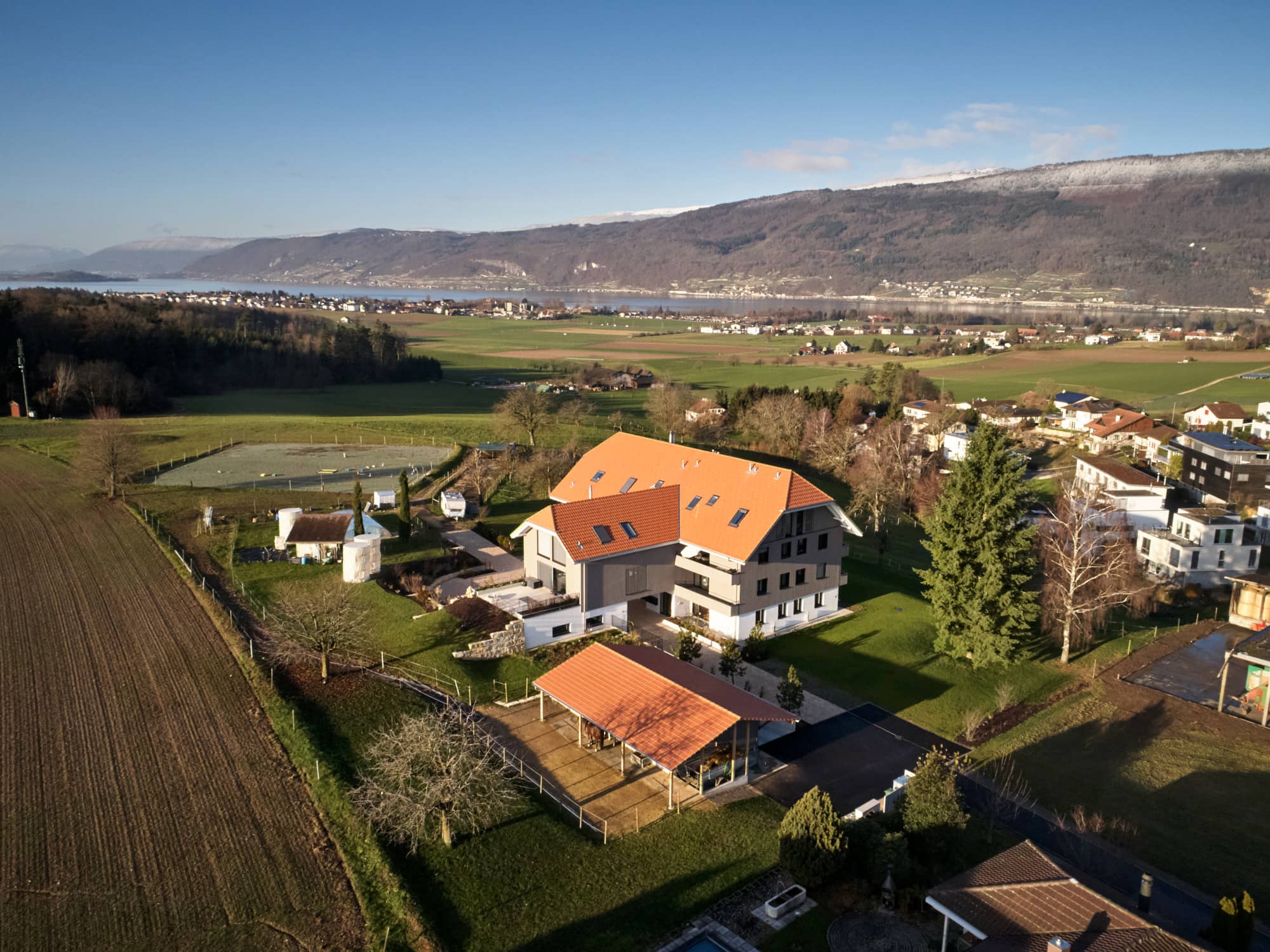 «Das Bauernhaus steht mitten auf einem Feld und bietet einen 180-Grad-Rundumblick. Wir haben freie Sicht auf den See und bis nach Cressier. Zum Bauernhof gehörten Pferdestallungen; die haben wir bestehen lassen, so dass sich Pferde ums Haus tummeln. Sehr idyllisch, es ist wirklich eine privilegierte Lage.»