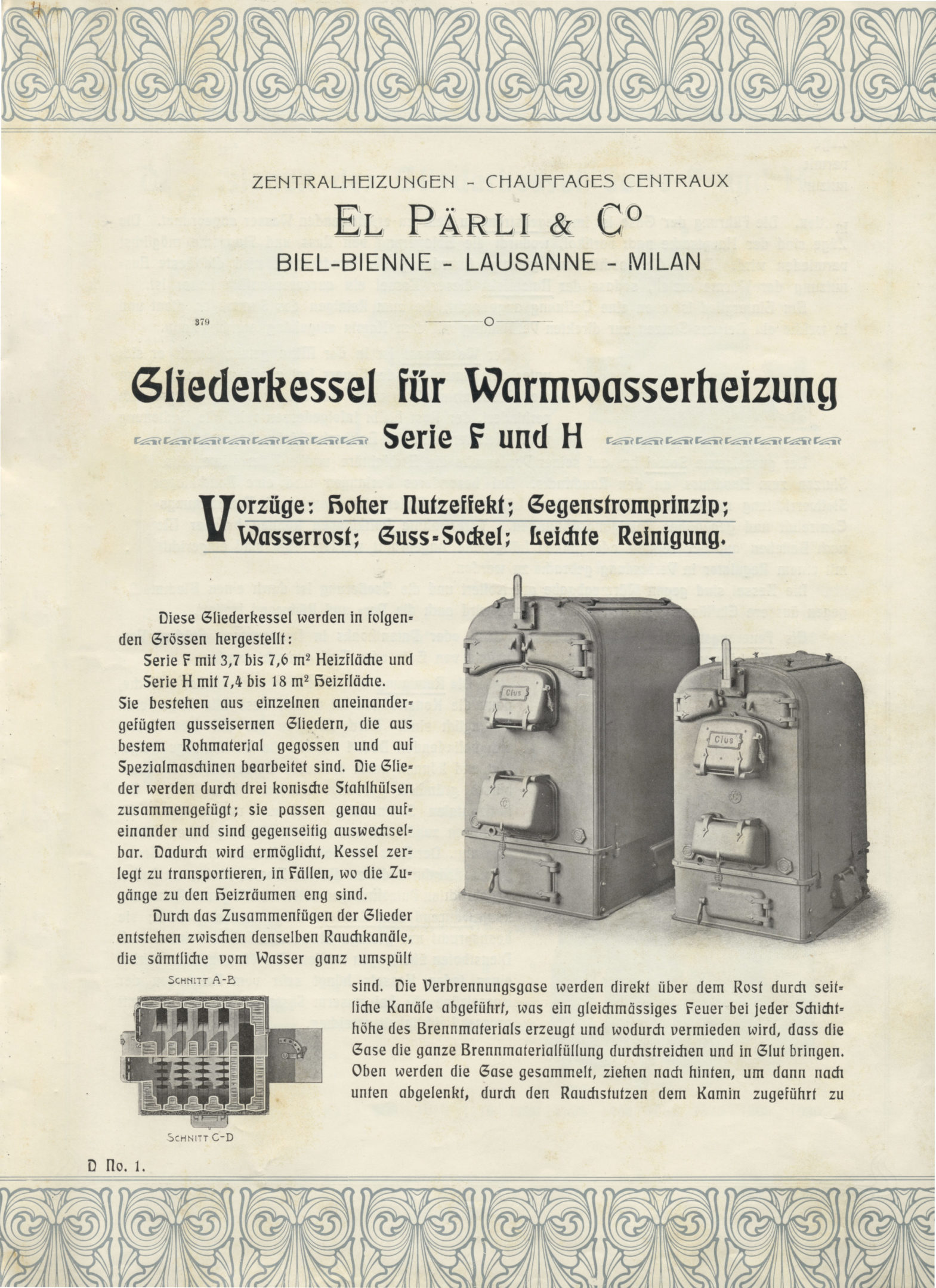 Dementsprechend bot Pärli denn auch bereits um die Jahrhundertwende einen «Cylinder-Badeofen mit Holzfeuerung» an, der ausserdem über eine «Kupferschlange zum Anschluss an die Zentralheizung» verfügte.