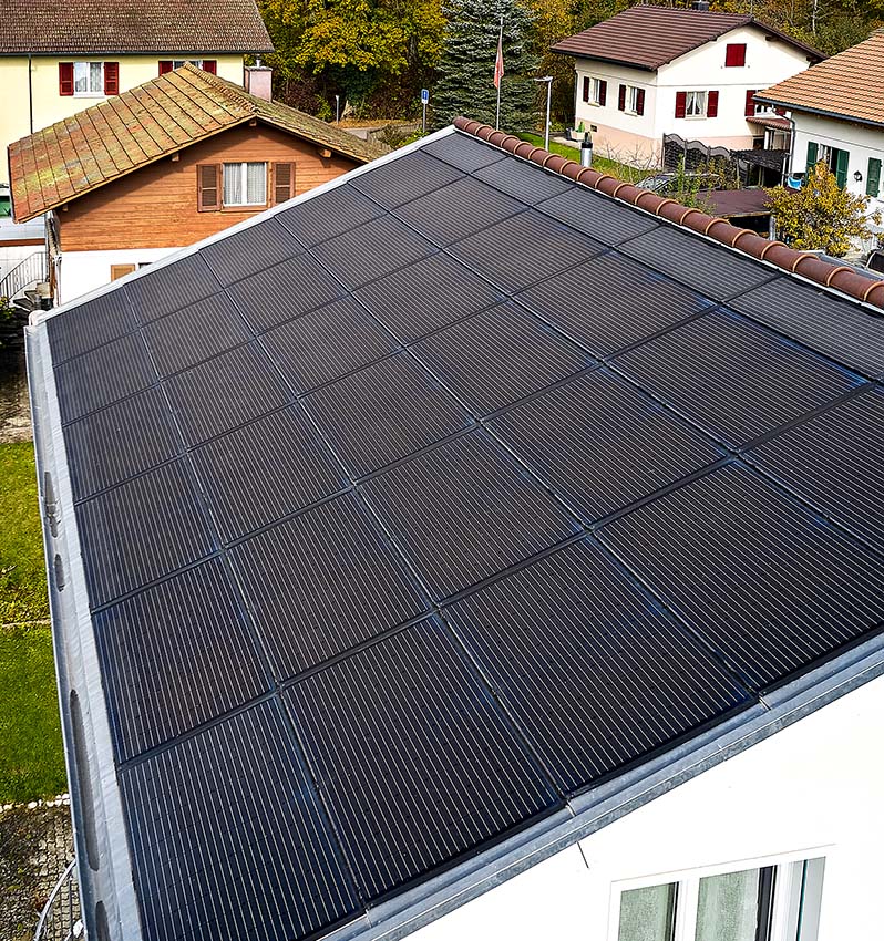 Pour atteindre une autarcie maximale, il est préférable de combiner la production d’électricité photovoltaïque avec un chauffage par pompe à chaleur. «En été, la production de l’installation photovoltaïque suffit largement, de sorte que l’excédent peut être injecté dans le réseau; en hiver, en revanche, il faut souvent recourir à l’électricité», explique Marco Bachofner. Bien qu’il soit aujourd’hui possible de stocker l’énergie avec des accumulateurs ou des batteries modulaires, il se peut que cela ne suffise pas tout à fait. «La raison en est notamment qu’une pompe à chaleur fonctionne à l’électricité et que sa consommation est plus importante en hiver.» Dans notre région, ce sont majoritairement des pompes à chaleur air-eau qui sont installées, car il n’est pas possible de recourir partout à des sondes géothermiques pour exploiter la chaleur des eaux souterraines. «Mais les installations air-eau actuelles sont extrêmement efficaces», poursuit Marco Bachofner; «de plus, l’électricité produite par l’installation photovoltaïque peut également être stockée dans des accumulateurs tampons ou des chauffe-eau grâce à des corps de chauffe électriques». Les installations solaires thermiques jouent un rôle plutôt secondaire dans notre région, car elles peuvent être utilisées moins efficacement en hiver. Elles peuvent toutefois constituer un bon complément selon l’installation.
