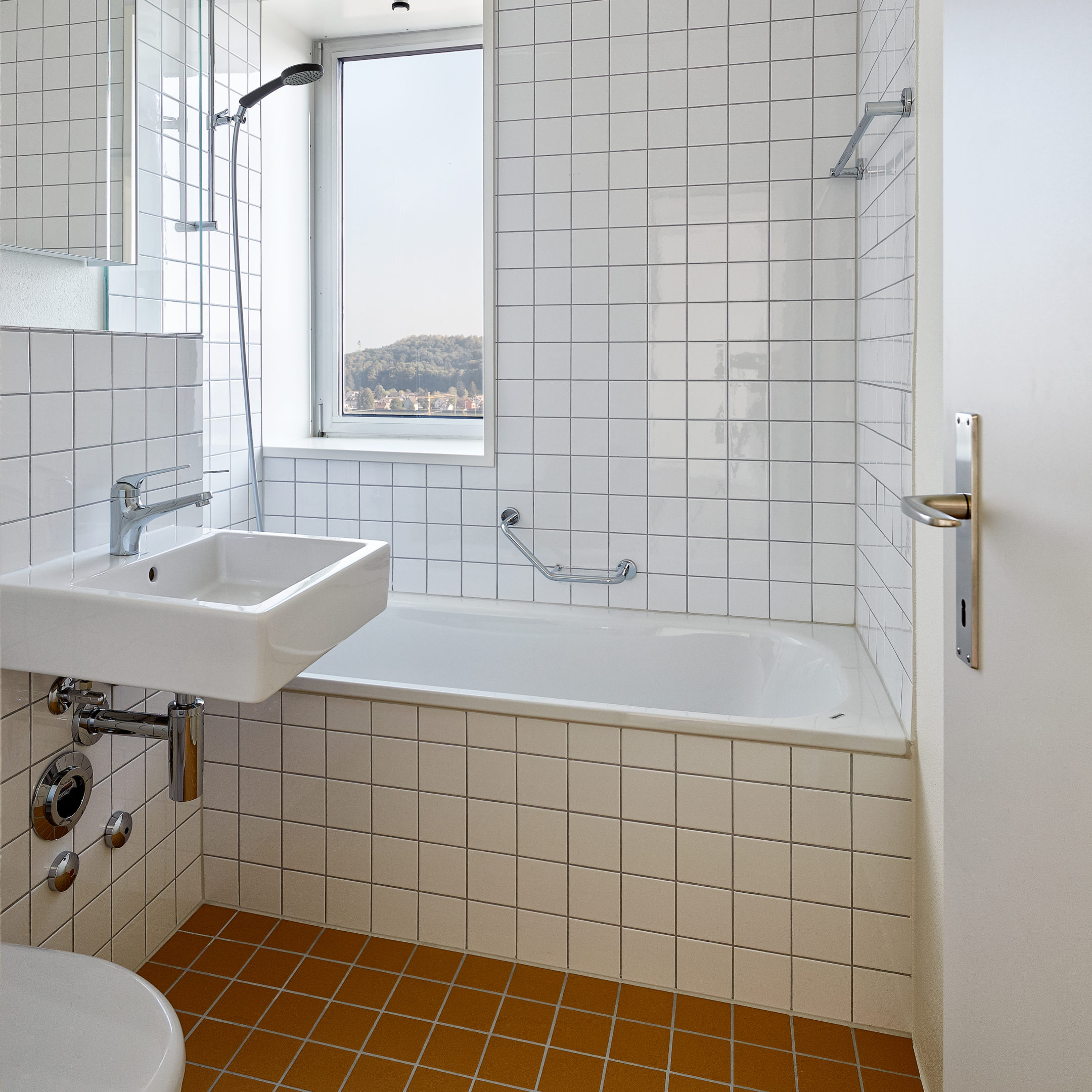 Le travail inhabituel dans une maisontour a aussi posé son lot de défis, raconte Yves Schaad, amusé. «Lorsque l’on arrive au dernier étage et que l’on se rend compte que l’on a oublié un tournevis, on perd rapidement vraiment beaucoup de temps!» Tout le matériel a aussi dû être amené à cette hauteur. «On a installé à cette fin plusieurs monte-meubles, mais ils fonctionnaient à une vitesse que l’on pourrait qualifier de médiocre.» On avait utilisé des matériaux plutôt standard dans les salles de bain: WCs, lavabos, robinetterie, douches, et le tout dans un espace restreint. «La disposition des appartements correspond aux idées des années 1960, les salles de bain sont petites et étroites.» Il fallait aussi respecter les consignes de la protection du patrimoine. Les salles de bain suivent donc un concept de couleurs qui rappelle le début des années 1970, par exemple avec des carreaux verts, bleus, jaunes et oranges. «Mais nous n’avions pas de contact direct avec la protection du patrimoine et le défi a donc surtout été relevé par les architectes. Nos monteurs ont vu ces couleurs pour la première fois lorsqu’ils ont procédé au montage final.»